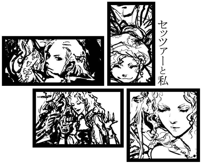 無理かなーと思ったらここは512kbまでアップ行けるんだそうで。 300いくつだったので余裕! しかし基本モノクラー(白黒ばっかりの人。今作ってみた。…)な上ここ用の手持ちがたいていオンラインツールというか手ブロのデータばっかり(……)なので100超えると重い気がしてしまいます貧乏性 (そのせいか軽くするの張り切りすぎてうっかり線ぼかしてしまったりもありますが。ああ〜) ところで「…なうえ」て打ったら「ナウ絵」って出た訳なんですが何それそんなの描いてみたいわよ!!^^ 動いてる人をかくとその動いてるパワーを絵にも効かせてもらえる感じがして好き こういう他力本願というのも有る訳ですね^^ 絵がって言うよりキャラクターが割と自分のイメージに近い感じにかけた気がしててちょっとなんかオマケというかちゃんと…でもないけども一回なんかしたかった8の三人娘でした リノア特にむずかしいス個人的に あと背景、実はカメラのフィルム(上下に穴開いてるやつね)の型が原型だったのですが色々やってるうちにそんなの言わなきゃわかんないわよ!という出来になりましたが…まあいいんだ…、…。 なんかこういうステージとか部屋みたいに見えたら嬉しいなあ あ〜〜8もアーカイブス出てるんですよねやりたいです… 一度やったゲームはある程度油断して出来るのでそれがさらにPSPでできるっていいよね まあたいてい気付けばほこりを被ってしまっていたりハッやりたい!と思っても充電切れてたりして哀愁な感じですがうちのPSPさん…(ごめんよ…) はっタクティクスオウガは買いましたので!!やりますので!!!^^^