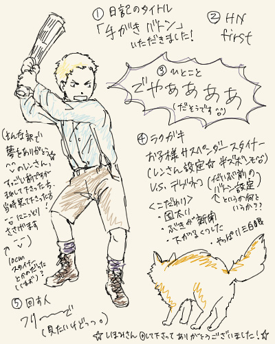 ここサムネイルになっちゃうのですが (すみませんクリックで拡大してみて下さいね) 遅くなりましたが、回して下さったのはしほみさんでした! 何かもうここぞとばかりに、小ずるく、色んな願望を詰め込ませていただいておりますが(すすいません)、うれしかったですーー^_^ どうもありがとうございました! しかし そういうバトンだよねと勝手に解釈して全部字も中に入れ切ろうとしてみたらただでさえyavai書き文字なのに細かくて読みにくいったらありゃしない でも読めなくてもきっと大丈夫です… / そして他のバトン関連ですが なすさんの(お受け取りどうもです!^_^)ぐでんぐでんで思い出したのですが、12のビュエルバで銘酒ビュエルバ魂を渡すとぐんにゃりモードになる街の人達がいますが、私も自分を無理にキャラに当てはめるとするならあの人達が一番近いっていうか親近感湧く人たちかも知れないぜ…(お酒云々でなくて普段からあんな感じ…)とふと思ったのですが… そんな自分なので とにかくパ…違う違う(笑顔に動揺したらしい)バルフレアにはびっくりするしかないぜ 光栄です! 女の子に話しかける時はお嬢さんって呼びかけるようにしようと思います(かなりの本気) ところで 例えていただくキャラがなにかいつも男性なのですがそれはあまり深く考えないでいいですよね 誰かそう言ってあげて 追> キャッレンさんもバトンお答えありがとうございました!(おおお伝えしたい事がどんどんたまってゆく〜〜) しかし同じバトンで 上半身裸もしくはパジャマなスタイナー で振っていただいてました何てこともうとりかえしがつかない 誰か誰か PR コメントを投稿する