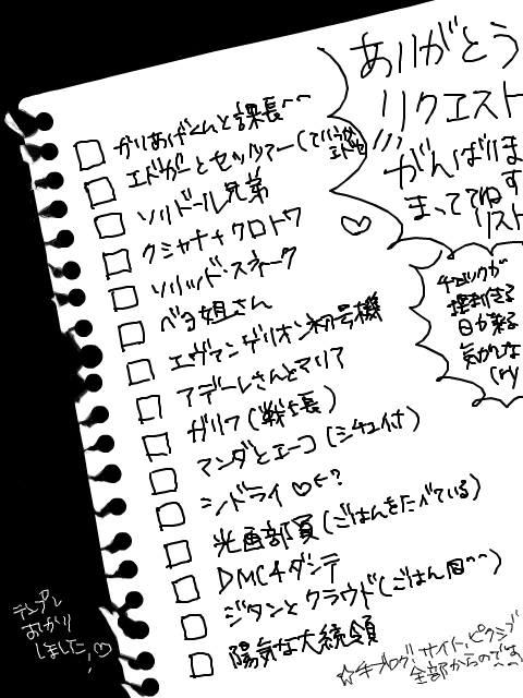 何が嬉しいって別の方からシチュエーションというかそういうのが近い感じでいただいたりとかそういうのが、何だかすごく個人的にニヤニヤしたのです…うへへh ごはんたべてるとかいいですよね…!にやあ がんばります! あとカップリング?とか、そうでなくとも複数でとか見る方としては相当好きなのですが自分でかくとウウン?みたいなあれで残念な事になるのが常道、なのですがうれしいです。つい楽な方へ流れがちでぼんやりかいてると単品多めなのですが、画面に二人いるとそれだけでさてこの人達なにしてんのかな!ってなって面白いですね。 どんなかんじがいいかなー!楽しい。 / ちょっと来月まで色々貯め込んでしまい今後〜来月前半げっそりめなスケジュールなのですが間空きそうですがこそこそログ上げとかには浮上したいです。 あっ後ピクシブ見て下さった方、お気に入りとか評価とかうれしいです無意味に大きくてすみません…!ちょっスタイナー本当はみんなお好きなのでは…?えええかいてくだsいえなんでもないでs 自分最近特にもえと絵が直結してなくて悔しい限りですがちょっとスタイナータグ3ページ以上になるまでがんばるべき…?てとても思いました(むり …あんまり大きな声で言えない感じですがスタイナー好きなのとライト(鎧)さん好きなのと個人的には意味が少し被る(別にいいんだ個人的意見でも…、)んですがスタイナーのが明らかに描いてくれる絶対数が少なくて泣ける…。 まあなんか堅物というか変に真面目な人すごい好きですスタイナー変にどころかいらんほど真面目というか堅物過ぎますけれども…ううう上手く言えない まじめ過ぎてどっかいっそおかしいレベルの人とかが相当好きです、男女問わず / <個人備忘録> バトン gogoリベンジ かきかけ× ザワさん 制服の二人 PR コメントを投稿する