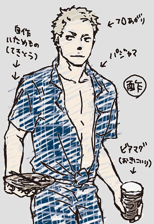 無駄な語りはのちほど!^^☆ / <7/30追記> どこがのちほどなものかと自分を罵倒しつつこんばんは!(のりが大切)★ ありがちですが日常の波に流されてザッパーーンみたいなあれでしたまったくもう(まだ続く罵倒) ただなんか来月初め予定だった諸々がこっち(今月)に前倒しとかそういうあれなので自分としてはしめしめ今めんどくさいけどこれで来月頭に余裕が…?みたいなうれしいあれではあったんですが、多分そんなこと言ってるうちに気付けば何かにまた追われている運命よね、と自嘲気味に…(ループループ そんなことはどうでもいいのさ(そうですか?)、 上のスタイナーのことですが。読んでくれちゃう君、本当にどうでもいいから気をつけてくれよ? _ 身内ネタで恐縮ですが。 私の父がこういう、…おしゃれ?…大丈夫?みたいなねまきの結び方アレンジをしているのを見掛けたので、でも、まあ、いいじゃないか、個人の趣味だし…とつっこみをしばらく控えていたのですが、これをかいた晩とうとうそれもこらえきれなくなりましてつい 「それは おしゃれなのですか?(Is it OSHARE?)」 と聞いてみましたら、 「ちがいます(No.)」 (*以上、なんちゃって直訳風でお送りしました) とのこと、では、なんなのか、と詳しく聞いてみたら、 「とくにおしゃれではないが、普通にボタンを留めると暑い。しかし、前を全て開いて着るのもみっともない(≒下品である)、その上お腹が冷える。そして以上の問題(条件)を全てクリアする着方がこの着方なのである。これでお腹も冷えずに涼しく快適に過ごせるのである(*意訳)。」 という答が得意気に返されたのでした それが何かこう微妙にツボだったので(本人から離れてからそっと笑いました娘の配慮)、そしてあくまで私個人のスタイナー像ではありますがそのスタイナーならなんかもう絶賛こういう事言いそうだなこういう根拠の無い若干かわいそうな感じの「ふふん」が随所にありそうだなとつい思ってかいたのでした全国スタイナーファンの皆さんごめんなさい父は無論全くスタイナーに似てない訳ですが無理矢理妄想のキャラにその辺に転がる実際の事象をくっつけて「そうだ、こんな人いるよね」と思いたいのがありがち二次ファン心理ということでひとつ!!なにとぞ!!!(たたみかけるように) ていうかそんなスタイナーいて下さい(開き直り) ヤダこの人怖い^^ さら に言うとこれはベア様の帰りが遅いか出張(?^^)で帰らない日の個人晩酌スタイナーという設定 です あいたたt(何かもう私の頭の中ではかれら普通に同居している訳ですがかわいそうな目で見ないでね★) 二人でいるのも楽しいけどたまに一人の日とかあるのって変に開放感あって楽しいよねっていうあれと、スタイナー多分ザ・野外の料理的な焼いただけ!とか炊いただけ!とかそういうので料理した!とか思ってそうというのがありまして(ピクルス好きは自分でできない系のものとして尚更レア度が上がるというか、そういうので好きだとおもしろいな!)、ベア様いたらもうちょっとはがんばるけど、一人だったら尚更適当、でも満足!だったらたのしいなあという。 さらにこのあとこのスタイナーは予定より早く帰れたベア様にまんまと楽しく酔っぱらってそのへんで寝てしまっている所を見つかってコラーー!ってなる所まででワンセットですそこは譲れません… 半分寝ている状態で「また野菜も食べないで!」とか言われても半分寝ているので妙にきっぱりと「大丈夫だ、問題な(略」とか言って尚更叱られますがぬかに釘でにこにこ半覚醒続行で当然翌朝にも覚えてなくて尚更しかられます あーーたのしい^^ (自分せいかくわるいので人が油断してたり間抜けだったりする場面が好きですいませんやめないけど!^^) あ と ビアマグはちゃんとお揃いで二つありますがベア様はワインとか好きそうなのでスタイナーの方はヘビロテでベア様の分はたまにお付き合いで使われる程度かと ああーーお付き合いでビール付き合うベア様って自分で言っといてときめきます…^^ (あとビアマグ普通にベアマグって打ってた何それ下さい^^^^) 以上 読んでくれた方お疲れ様でした!!本当にな!!(ごめn PR コメントを投稿する